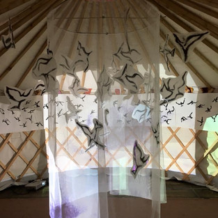 Take a look at the first picture. This is a community artwork that I made during the same residency that produced Flock, which I talked about in May. It is called Murmur and took the idea of how starlings flock together making haunting, ever shifting shapes in the sky. Starlings are known as the ‘bovver boys’ of the bird world, and yet when they come together, they create such delicate beauty. I recently learnt that each bird in the flock has seven other birds whom they ‘attend to’, ensuring that they are safe and keeping them together. Each of the seven also have another seven they look after, and so on. The most stunning displays of ‘murmurations’ are created when there is a predator close, and the starlings flock together in such a way as to confuse their enemy and to hide themselves in the whole.